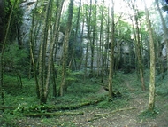 s'enfonce dans la forêt, vite surplombé de blocs de rochers en équilibre.
