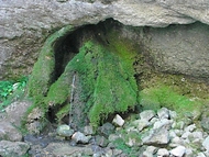 A son pied une fente pleine de mystère et un filet d'eau émergeant d'une bosse