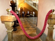 ![]() Le vestibule est le lieu central. Son balconnet ne repose sur aucune pile, dispositif rare. ![]() Il est décoré de magnifiques peintures murales en trompe-l’œil. Le long des escaliers se font face les effigies du Roi de France et du Duc de Savoie, peintes au 18è siècle par un artiste italien itinérant.