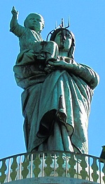 ![]() Elle a été financée par une souscription lancée par les Voironnais en 1864. " La loterie du 30 mai 1867 permet de financer en partie le projet et, grâce à la générosité des commerçants, 440lots sont réunis. L’empereur Napoléon 3 offre lui même un lot d'une valeur de 2000F. 20 000billets sont vendus et rapportent 10 000Fr" La statue est une copie aux dimensions réduites de celle de Notre Dame du Puy. Elle a été exécutée en cuivre rouge par un chaudronnier de Saint Laurent-du-Pont . Elle fut exposée sur la place du Marché, bénie devant l'église St Bruno alors en construction, puis transportée en pièces détachées à l'aide de brancards portés par de jeunes volontaires, et un char à bœufs pour le piédestal. La vierge couronnée d'étoiles est debout sur un demi-globe terrestre. Elle y écrase un serpent, et tient sur son bras droit l'Enfant Jésus qui bénit la ville.
