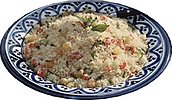 ![]() pour 4 personnes - 200 g de boulghour (blé concassé) - 4 tomates fermes - 4 oignons blancs - 1 bouquet de menthe - 1 gros bouquet de persil - 1/2 poivron jaune - 50 g de raisin secs - 2 gros citrons - 6 cuillères à soupe d'huile d’olive - 1 cuillère à café de sel - poivre du moulin • rincer le boulghour pour enlever l’amidon, égoutter, mettre dans un saladier. • verser de l’eau froide à hauteur de 15 cl environ. • laisser gonfler 1h à 1h30. Les grains restent un peu fermes. • mettre les raisins secs à tremper dans un bol d’eau froide. • presser les citrons, équeuter le persil et la menthe. • ciseler ces herbes séparément: 1 bol rempli de persil,1/2 de menthe. • partager les tomates en deux, épépiner, puis détailler en petits dés. • ébarber, peler et hacher les oignons blancs avec un peu de leur tige verte. • tailler le poivron en petits cubes. • verser le boulghour dans une passoire, • laisser égoutter puis essorer avec les doigts pour enlever l’excédent d’eau. • verser dans un plat creux et ajouter le persil, la menthe, les tomates, le poivron, les oignons et les raisins secs égouttés. • mettre une cuillerée à café de sel dans un bol, ajouter une bonne pincée de poivre, le jus de citron, et l’huile d’olive. • mélanger puis verser cette vinaigrette sur le boulghour ; mélanger de nouveau • laisser macérer 2 h au réfrigérateur avant de servir. . |
